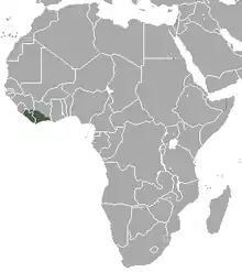 Habita al sur de Guinea Ecuatorial, Liberia, Costa de Marfil y Sierra Leona.