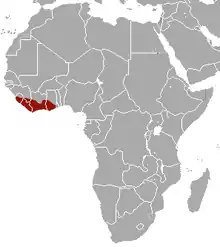 Se encuentra en Costa de Marfil, Ghana, Guinea, Liberia y Sierra Leona.