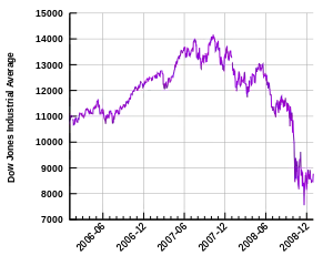 - 9 de noviembre: Wachovia, la cuarta institución financiera en importancia de EE. UU., se convierte en el más reciente de los bancos en hacer sonar la alarma al anunciar pérdidas por unos 1100 millones de dólares en octubre.[83] La banca británica se desplomó en bolsa por el temor a un contagio de la crisis.