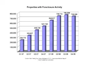 - 2006: El tipo de la Reserva Federal de los Estados Unidos aumentó hasta 5,75 %. En tres años, el tipo había aumentado del 2 % al 5,75 %.[6] Los préstamos subprime eran, por ese entonces, más a menudo a tipos variables e indexados al tipo decidido por el banco central. Los prestatarios, que eran cada vez más, no podían pagar sus plazos.[7] Sus hogares fueron vendidos en subasta y los resultados de esto fueron más bajas en los precios de la vivienda y, por tanto, en el valor de las hipotecas.[8] Entre 2004 y 2007, 1,2 millones de estadounidenses habían sido expulsados de sus hogares.
