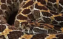 Marcas en el costado de la cabeza incluyen un punto grande debajo de la foseta termoreceptora que se extiende a las infralabiales. También un punto grande se extiende desde el margen inferior del ojo hasta el margen del labio superior y una ancha raya postocular se extiende desde cerca del borde del ojo hasta el recto. La parte superior de la cabeza está marcada por un par de puntos prefrontales frecuentemente de forma triangular.