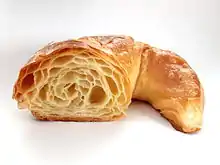 El cruasán (del francés ‘croissant’, AFI: [kʁwa'sɑ̃]; ‘luna creciente’,[1] también escrito como el galicismo croissant) es una pieza de panadería de origen francés. Fue creada en París en el siglo XIX donde los panaderos locales se inspiraron de la forma del kifli austriaco popularizado por el panadero vienés August Zang, pero usaron una masa hojaldrada fermentada típicamente francesa que se usa también para hacer otras preparaciones como la napolitana.[2] Dado que en el siglo XX la popularidad del cruasán se extendió a muchos países del mundo, existen numerosas variantes con ingredientes, consistencia y nombres propios.