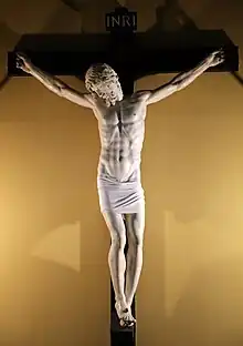 La cabeza está ligeramente inclinada hacia la derecha y no lleva corona de espinas. La anatomía está realizada con un gran realismo.