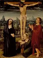 La obra, realizada en óleo sobre tabla y custodiada en el museo como la pieza 149 de su inventario, muestra a Cristo en la cruz directamente frente al espectador; figura sujeto al madero por tres clavos y exhibe ambas piernas estiradas y completamente rectas en una pose forzada, estando la cabeza tocada con la característica corona de espinas y caída sobre su hombro derecho. De acuerdo con Bermejo, María Magdalena, quien aparece de rodillas abrazando la cruz y besando los pies de Cristo, representa la remisión de los pecados, siendo el personaje más interesante del grupo; ataviada con una túnica renacentista en color verde oliva, la Magdalena se erige a su vez como el arquetipo femenino de las pinturas de Benson, describiéndola Bermejo como «más fina» que la imagen cristífera.[3]: 125 Como es tradición en este tipo de representaciones de la Pasión, a ambos lados del crucificado figuran la Virgen y San Juan. Ataviada con una túnica y un manto negros en contraste con una toca de color blanco, María luce actitud de recogimiento al tiempo que hace patente un gesto de tranquilidad y resignación, mostrando la cabeza agachada y en términos generales una actitud distante de la típica iconografía dolorosa. Por su parte, San Juan, vestido con túnica y manto rojizos, se muestra agitado por tener ambas manos frente al pecho en señal de desconsuelo, siendo la figura que más viveza aporta a la obra. Va descalzo y su rostro se yergue para contemplar a Cristo, luciendo un semblante de desconcierto que contrasta fuertemente con la serenidad de la Virgen. Las figuras poseen un modelado suave de contornos difuminados que se fusionan con el entorno, compuesto de rocas frente a un fondo en el que se muestra Jerusalén conformada por edificaciones de traza geométrica muy angulosa y claramente definida a diferencia del perfil de los personajes, todo dominado por un cielo cargado de nubes en diferentes tonalidades creando un curioso celaje. La tabla en sí hace gala de todas la características del catálogo de Benson, entre las que destacan dedos largos con articulaciones medias muy acusadas.[1]