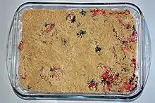 El crumble es un pastel con frutas. Se elabora con diversas frutas que se recubren con una masa de harina, manteca (generalmente mantequilla) y azúcar. Todo ello se introduce en el horno. Se suele servir como postre caliente acompañado de natillas, nata, helado o compotas de diferentes frutas.