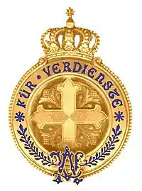 La insignia era de oro en la primera clase y de plata para el medallón de segunda clase. En el centro se halla una cruz flordeliseada con estilizadas flores entre los brazos de la cruz. El medallón está enmarcado por un collar de perlas y está coronado por una corona. En el margen del medallón se halla la inscripción esmaltada en azul FÜR VERDIENSTE (Al Mérito). En la mitad inferior del margen se hallan ramos de laurel flanqueados por las letras entrelazadas AV (Augusta Victoria). La insignia de la orden se llevaba con un lazo blanco en el pecho izquierdo.