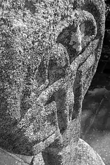 La cara oeste de la cruz presenta una crucifixión, mientras que la cara este tiene dos cabezas humanas muy desgastadas, ambas con barba y quizás una mitra. Hay otras dos cabezas en la cruz: una que sobresale del borde sur del anillo y otra que está situada en el lado noreste de la base.[4]