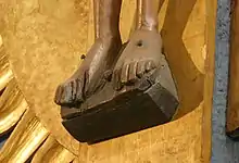 Los pies están de pie sobre el suppedáneo y cada uno está clavado a la cruz con un clavo, lo que es típico de la llamada fase de cuatro puntos de la iconografía cristiana (en la fase de tres puntos, ambos pies están atravesados por un clavo). En el pie izquierdo faltan dos dedos por fractura y/o erosión, y en el pie derecho falta el dedo gordo. Los talones están muy erosionados en la parte posterior. Por lo demás, la escultura se encuentra en un estado superior a la media para su edad.