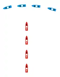 - el fuego de la escuadra (azul) que cruza la "T" se concentra en el navío que se encuentra en cabeza en la escuadra cruzada (rojo), para pasar a concentrarse en el siguiente cuando el primero ha sido hundido o ha quedado neutralizado,