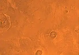 ![]() Mapa del cuadrilátero de Tharsis a partir de los datos del Mars Orbiter Laser Altimeter (MOLA). Las elevaciones más altas son rojas y las más bajas son azules. | ||