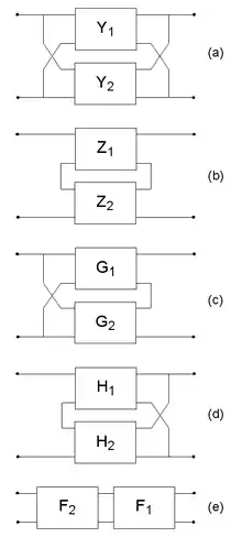 - Cascada. La salida del segundo cuadripolo se conecta a la entrada del primero. Como el producto de matrices no es conmutativo, es importante seguir este criterio. (FT) = (F2) · (F1).