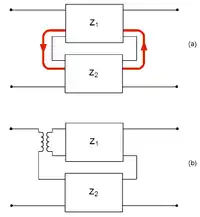 En realidad, en el caso de cuadripolos en serie, puede existir la corriente marcada en rojo en la figura 3-(a), que se cierra entre ellos, pero no pasa por los terminales del cuadripolo serie. Para evitarlo se introduce el transformador de (b).
