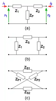 - Red en celosía. Esta red no tiene un nodo común a ambas puertas. Consiste en dos impedancias, ZS1 y ZS2, conectando los nodos de una puerta a la otra, y otras dos, ZP1 y ZP2, conectando ambas puertas, de modo que enlacen los nodos de ZS1 con y ZS2 (c).
