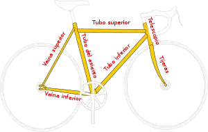 En el cuadro diamante, el triángulo principal está formado por cuatro tubos que se juntan mediante soldadura. Existen (básicamente) tres métodos para construir un cuadro: con soldadura con racores, soldadura a filete y soldadura TIG donde se unen el tubo horizontal, el tubo frontal (de dirección), el tubo diagonal u oblicuo, y el tubo del asiento. El triángulo trasero va unido al tubo del asiento, desde cuya parte superior salen un par de tirantes que bajan hasta las punteras traseras (para fijar la rueda), y otro par de tubos (vainas) que forman la horquilla trasera, y que van desde la caja del eje pedalier hasta las punteras traseras. En el tubo frontal se introduce la potencia que sostiene a la horquilla delantera y que se fija mediante un cono de blocaje (o de expansión) unido al sistema de dirección.[1]