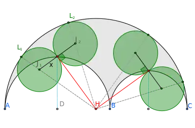 Luego, se trazan dos círculos con centros Ji; perpendiculares a HE; tangentes al semicírculo grande en el punto Li; tangentes al punto E y con radios iguales x. Usando el Teorema de Pitágoras: