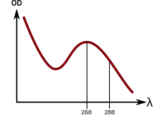 - La absorción a 230 nm puede ser causada por la contaminación por el ion fenolato, los tiocianatos y otros compuestos orgánicos. Para una muestra de ARN puro, la A230:260:280 debe ser de alrededor de 1:2:1, y para una muestra de ADN puro, la A230:260:280 debe ser de alrededor de 1:1,8:1.[9]