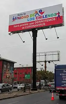 Esto dio inicio a una serie de medidas de prevención, contempladas en el estado de excepción constitucional de catástrofe y el código sanitario, como el cierre de todas las fronteras aéreas, terrestres y marítimas el mismo 18 de marzo;[6] la declaración de toque de queda nocturno en todo el territorio nacional a partir del 22 de marzo;[7] y el establecimiento de cordones sanitarios y cuarentenas, la primera de las cuales se inició el 26 de marzo,[8] con la asistencia y control de las Fuerzas Armadas de Chile. Asimismo, se iniciaron campañas de prevención de los contagios, promoviendo el distanciamiento físico y el uso de mascarillas en espacios públicos, siguiendo las recomendaciones de la Organización Panamericana de la Salud y de la Organización Mundial de la Salud.[9]