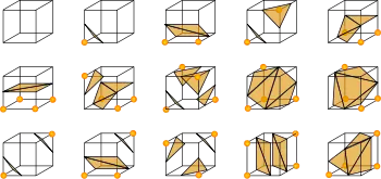 El algoritmo avanza por el campo escalar, tomando ocho ubicaciones vecinas a la vez (formando así un cubo imaginario) y luego determinando el(los) polígono(s) necesario(s) para representar la parte de la isosuperficie que pasa a través de este cubo. Los polígonos individuales se fusionan en la superficie deseada.