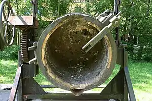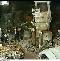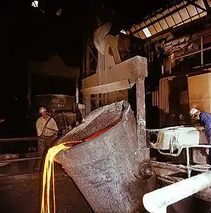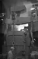 ![]() Cucharón en el que se aprecian el pico de vertido y la rueda manual para inclinarlo |