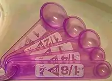 Un set o abanico de cucharas medidoras de plástico.