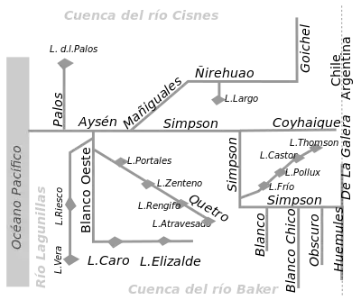 La cuenca chilena cubre parcialmente el territorio de las Provincias de Aysén y Coyhaique.