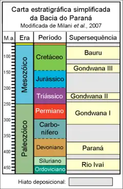 La columna sedimentaria de la Cuenca del Paraná fue subdividida por Milani (1997)[5] en seis unidades alostratigráficas de segundo orden o supersecuencias, según la clasificación de Vail et. al. (1977)[27] esto es, separadas por espacios significativos, como se ve en la figura de la columna estratigráfica. Estas unidades, descritas a continuación, definen el marco estratigráfico de la cuenca y son separadas por importantes hiatos deposicionales, causados por eventos erosivos.[1]