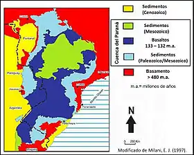 Supersecuencia Bauru: Esta supersecuencia cretácica, ocurre en la porción centro-norte de la cuenca, en los estados de Minas Gerais, São Paulo, Paraná, Mato Grosso del Sur, Goiás y Mato Grosso, así como en el nordeste de Paraguay. Está constituida por depósitos de arenisca y conglomerados de los grupos Bauru y Caiuá, que fueron depositados en el ambiente continental semiárido o desértico, en el llamado desierto de Caiuá.[1] Las rocas de esta supersecuencia son ricas en fósiles, inclusive de dinosaurios. Hasta el momento ya fueron encontrados restos fósiles de cuatro especies de dinosaurios de gran porte, del grupo de los saurópodos, incluyendo el Maxakalisaurus topai, el mayor dinosaurio montado en Brasil.[30]