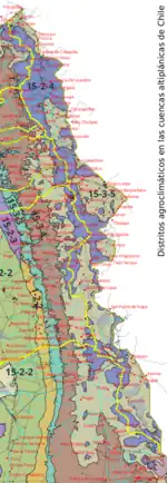 Distritos agroclimáticos en las cuencas altiplánicas. La línea amarilla delimita los ítems del DGA. En rojo las localidades.