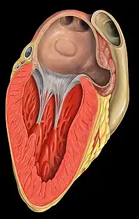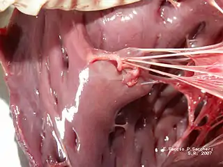 ![]() En la imagen son visibles las válvulas mitral y aórtica, los músculos papilares y las cuerdas tendinosas. | ||