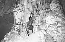 En el fondo hay tres ramificaciones, de las que dos, las de la derecha y del centro, concluyen á los 10 y 40 m. respectivamente. Queda el boquete de la izquierda, cerrado por una puerta, puesta allí por dos humildes artesanos, quienes indignados por las destrucciones vandálicas perpetradas en las grutas, las han alquilado para poner fin á tan estúpidos excesos; hermoso ejemplo que debería seguirse en miles de las cavernas de nuestro suelo. Una fuerte corriente de aire que apaga las bujías, advierte al poco rato que el local se modifica. En efecto, á nuestros pies abre su negra boca un pozo de 4'50 m. de profundidad y al que se baja por una escala.(Heintz Loll, 1915-1921, pp. 84-86)