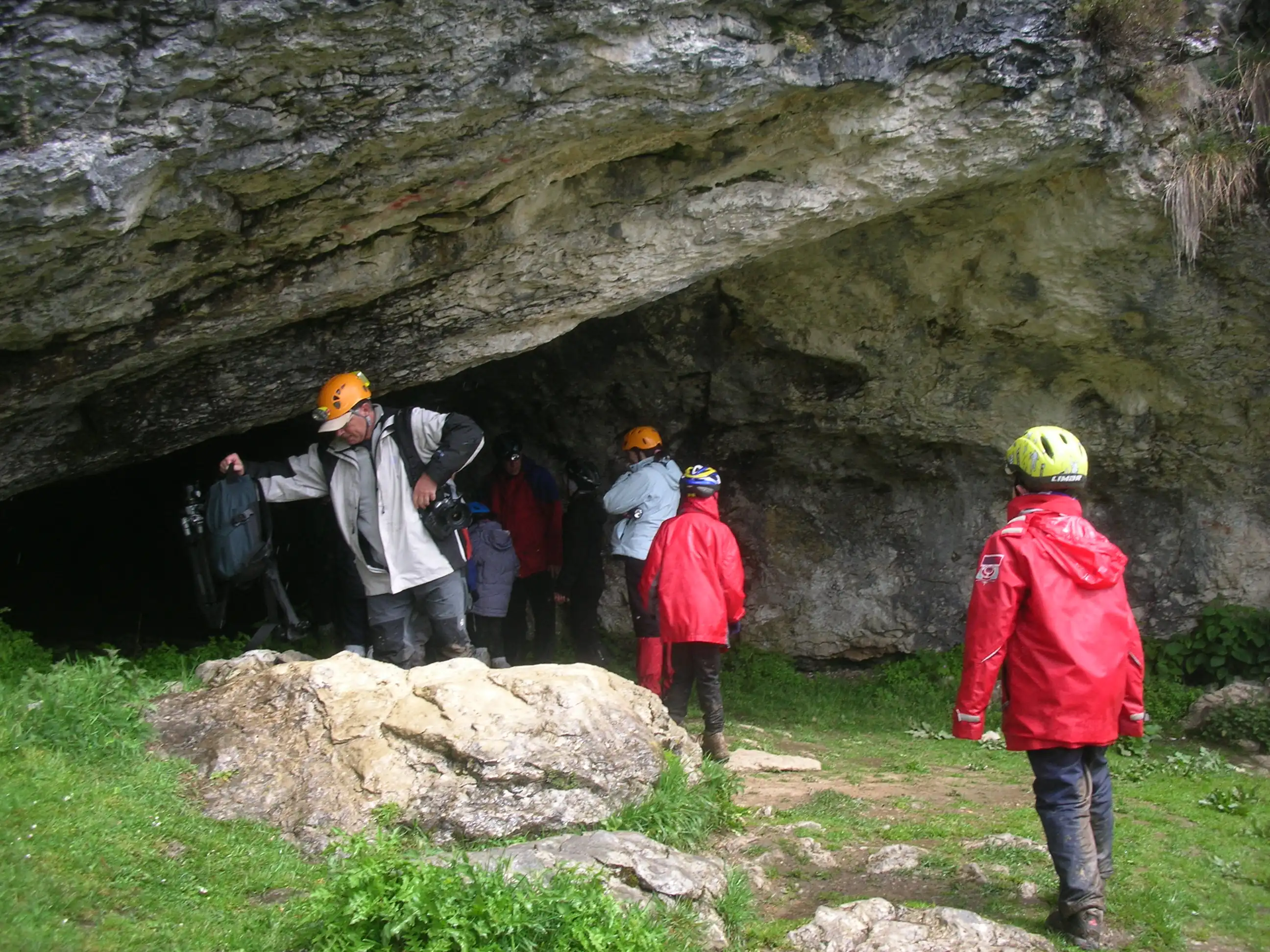 Mairuelegorreta.―Es de todas las cavernas que hemos explorado la más grande é imponente. Se llega á ella trepando durante media hora por la vertiente meridional del Gorbea. Allí se descubren tres boquetes en la peña, separados de 15 á 20 m. uno de otro: el del medio dá acceso á la famosa gruta. La entrada propiamente dicha al S., es triangular, con una anchura en la base de 9 m. y una altura de 2'50. El vestíbulo sirve de refugio, cuando el tiempo es malo, al ganado vacuno, caballar y de cabra, que pasa en estas alturas gran parte del año. Inútil decir como está el piso con semejantes huéspedes; sólo saltando de piedra en piedra se puede franquear, sin enlodarse, los 15 primeros metros, en donde la basura es más abundante. Pero luego ya se pisa la roca limpia, y así continúa hasta el fin de este callejón de 78 m. de largo por 9 de ancho y 5 de alto, dimensiones estas últimas que van disminuyendo poco á poco.