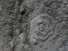 Están en muy mal estado de conservación por las concreciones calcáreas y salinas, siendo reconocible una figura triangular de donde salen rayas paralelas a la superficie entre sí. Realizada en rojo bermellón. A 2 metros de la superficie hay un grabado en forma de espiral de tres vueltas. Los ábsides más grandes y profundos están ennegrecidos por el humo. Las pinturas están muy mal conservadas, y se constatan pérdidas en el soporte de la roca y pátina brillante que afectan a las figuras.[2]