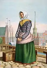 Los trajes tradicionales daneses varían de unas regiones a otras y se retrotraen a un período comprendido entre 1750 y 1900, cuando las ropas se tejían en casa, hilando con lana o lino. En las comunidades rurales, la elaboración de prendas de vestir, tanto para los miembros de la familia, como para la servidumbre, formaba parte del quehacer cotidiano. El artista Frederik Christian Lund, que había viajado por toda Dinamarca como soldado durante la Primera Guerra de Schleswig, se interesó por hacer bosquejos de gentes del pueblo, vestidas con sus trajes típicos. En 1864, completó una colección de 31 bocetos a color, que publicó como litografías en color bajo el título Danske Nationaldragter (Trajes Nacionales Daneses).[7]
