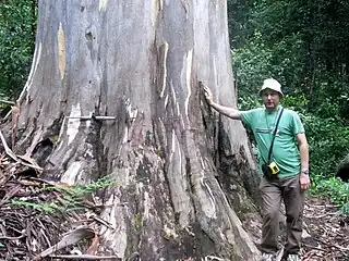 ![]() Dean Nicolle junto al tronco de un Eucalyptus deanei en el Currency Creek Arboretum. | ||