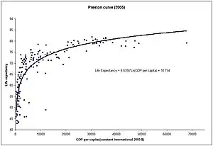 La curva de Preston, usando datos del año 2005. El eje de abscisas muestra el PIB per cápita en dólares constantes y el eje de ordenadas la esperanza de vida al nacer. Cada punto representa un país.