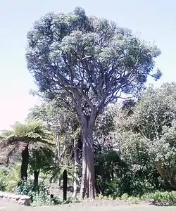Alcanza hasta 15 m de altura.[3] El tronco es muy grueso, y con corteza de corcho gris. Hojas perennes, de hasta 70 cm de longitud, palmeadas digitadas, con 5 a 9 folíolos de 30 a 35 cm de largo cada uno. Flores pequeñas de color verde amarillento, dispuestas de forma apretada en umbelas de 8 a 12 espigas gruesas y densas, de 5 a 15 cm de longitud. Frutos redondeados o angulosos con 4 a 6 mm de diámetro, de color marrón y al madurar púrpura.[2][4]