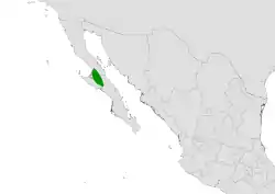 Endémica de los estados de Baja California y Baja California Sur en México, con un área de distribución reducida no mayor a 10000 km², entre la frontera de ambos estados. Habita en planicies arenosas y en matorrales xerófilos en asociación con Yucca valida. En elevaciones no mayores a 48 m s. n. m.[1]