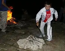Como se puede observar en la imagen sobre la fiesta, junto a la candela donde se calientan los gamones se coloca una o varias piedras grandes que sirven para golpearlos y provocar la sonora explosión.