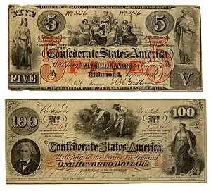 Inicialmente, moneda para la Confederación fue aceptada en todo el sur como un instrumento de cambio con un alto nivel de poder adquisitivo. Sin embargo, a medida que avanzaba la guerra, la confianza en el éxito final de la moneda desapareció, la cantidad de papel moneda aumentó, y sus fechas de amortización fueron aún más en el futuro. El resultado de la desaparición de la moneda fue inevitable, con el aumento de los precios y sus características de inflación. Por ejemplo, para el final del conflicto, una pastilla limpiadora de jabón era vendida a $50 y alguna prenda ordinaria de ropa a $ 2700. Cerca del final de la guerra, se convirtió en una moneda casi sin valor como medio de intercambio. Tras la desaparición de la Confederación, la moneda perdió todo valor como moneda fiduciaria.