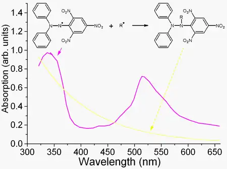 El DPPH en disolución tiene un color violeta oscuro y presenta una fuerte absorción a una longitud de onda de 520 nm. Al añadir una sustancia capaz de ceder un átomo de hidrógeno, el DPPH se reduce y se convierte en su forma no radicalaria. En estas condiciones la disolución pierde la coloración violeta, que se sustituye por un amarillo pálido y tiene lugar una acusada disminución de la absorción a 520 nm.