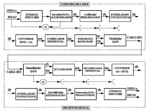 IyQse someten a un filtrado de raíz de coseno alzado, con factor de redondeo (roll-off) de 0,15. - Modulación: una vez filtrada la señal se modula en QAM y se envía, la constelación utilizada puede ser de 16, 32, 64, 128 o 256 símbolos. La cadena receptora hace los procesos recíprocos para obtener la señal MPEG-2 enviada.
