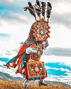 La vestimenta se compone del faldón y camisa de color blanco, la pechera que representa la chacana o cruz andina. Está adornada con monedas antiguas y bambalinas. Atrás va la banda con tela de siete telas de colores que representan al arco iris, en el cabezal sobresalen el sol y el plumaje de pavo real además está elaborado con madera de espino blanco que luego de un proceso puede darle la forma ovalada. posteriormente las partes son ajustadas con cauchos (soguillas elaboradas con cabuya) y es decorada con una tela de color amarillo y abundantes espejos[5] Todo el traje consta de 12 piezas: cabezal, pechera, espaldares, enagua, pantalón, camisa, cinturón, mangas, cintas de colores, cascabeles, alfangue (una especie de vara con cintas de colores que se lleva en la mano) y la macana, que se utiliza en la cabeza para sujetar el cabezal. Esta prenda es la más llamativa de un danzante, está adornada por varios espejos, plumas de colores y joyas.