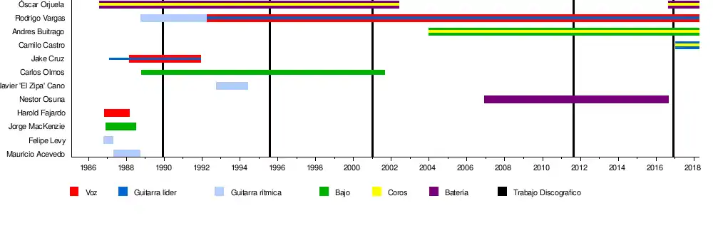 Rodrigo Vargas ( Voz & Guitarra)1986-2017 Carlos Olmos (Bajo) 1987-2001 Jake Cruz (Voz & Guitarra) 1987-1991 Néstor Ozuna (Batería) 2002-2016 Javier Cano (Guitar) Felipe Levy (Guitarra) 1986 - 1987 Harold Fajardo (Voz) 1986 - 1987 Mauricio Acevedo (Guitarra) 1987-1988 | ||