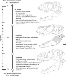 33. Currie, Philip J.; Hurum, Jørn H; Sabath, Karol. (2003). «Skull structure and evolution in tyrannosaurid phylogeny» (PDF). Acta Palaeontologica Polonica 48 (2): 227-234. Archivado desde el original el 25 de octubre de 2007.