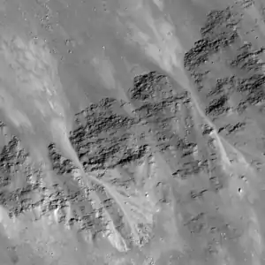 ![]() Detalle de la zona del cráter con aspecto de barrancos. Fotografía de la misión Lunar Reconnaissance Orbiter |