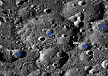 Por convención estos elementos son identificados en los mapas lunares poniendo la letra en el lado del punto medio del cráter que está más cerca de Debye.