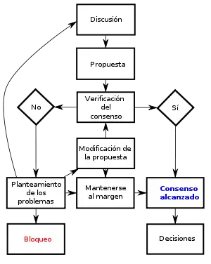 Más que una lista de alternativas conocidas, debate en corto tiempo, voto, y aceptación o rechazo por algún porcentaje de mayoría (por ejemplo, más del 50% o 2/3 partes), un proceso de decisión por consenso implica, identificar y discutir las inquietudes, generar nuevas alternativas, combinar elementos de múltiples alternativas y confirmar que las personas entienden una propuesta o un argumento.