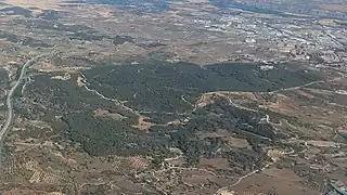 ![]() Vista de la Dehesa del Carrascal desde el sureste, con la autovía del Este a la izquierda y la localidad de Arganda del Rey arriba a la derecha. | ||