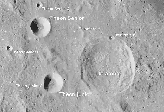 Delambre es un cráter de impacto lunar que se encuentra al suroeste del Mare Tranquillitatis, en la región central del altiplano. Al oeste se encuentra el par de cráteres Theon Junior y Theon Senior, estando este último más distante y situado al noroeste. Tiene 52 kilómetros de diámetro y 3,5 kilómetros de profundidad. Debe su nombre a Jean Baptiste Joseph Delambre, un astrónomo francés[1] del siglo XVIII.