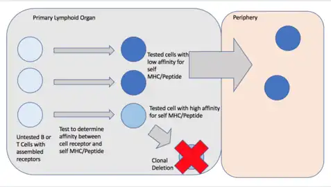 Los linfocitos B y T se prueban para determinar su afinidad por los complejos MHC/péptido propios antes de dejar los órganos linfoides primarios y entrar en la periferia. Si demuestran una alta afinidad por el autoantígeno, un método para prevenir la autoinmunidad es mediante la deleción clonal. Aquí es donde el linfocito recibiría señales apoptóticas de la célula presentadora de antígeno (APC).[2] Es importante señalar que no todos los linfocitos que expresan una alta afinidad por el autoantígeno experimentan una deleción clonal. Los linfocitos B también pueden participar en la edición del receptor de cadena ligera, el reemplazo del gen VH, o ser liberados y luego sufrir una selección negativa en la periferia.[3][5] En cambio, los linfocitos T pueden sufrir detención clonal, anergia clonal y edición clonal.[1] Si las células autorreactivas escapan a la deleción clonal en el timo o en la médula ósea, existen mecanismos en la periferia que involucran a las células T reguladoras para evitar que el huésped contraiga una enfermedad autoinmune. Sin embargo, tanto para las células B como para las células T en los órganos linfoides primarios, la deleción clonal es la forma más común de selección negativa.